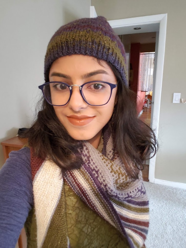 shelly wears a colorwork hat and shawl