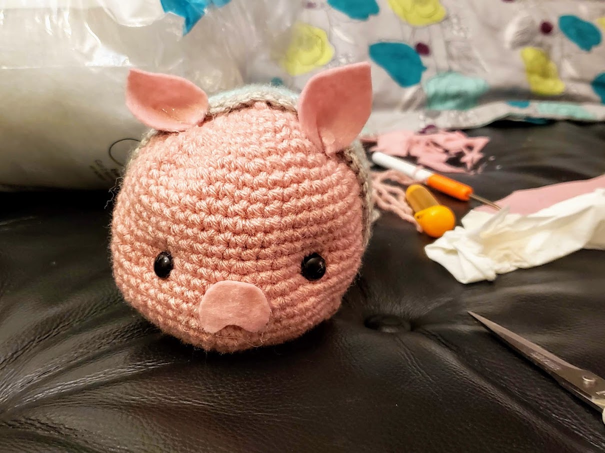 a pink crocheted pig stuffie
