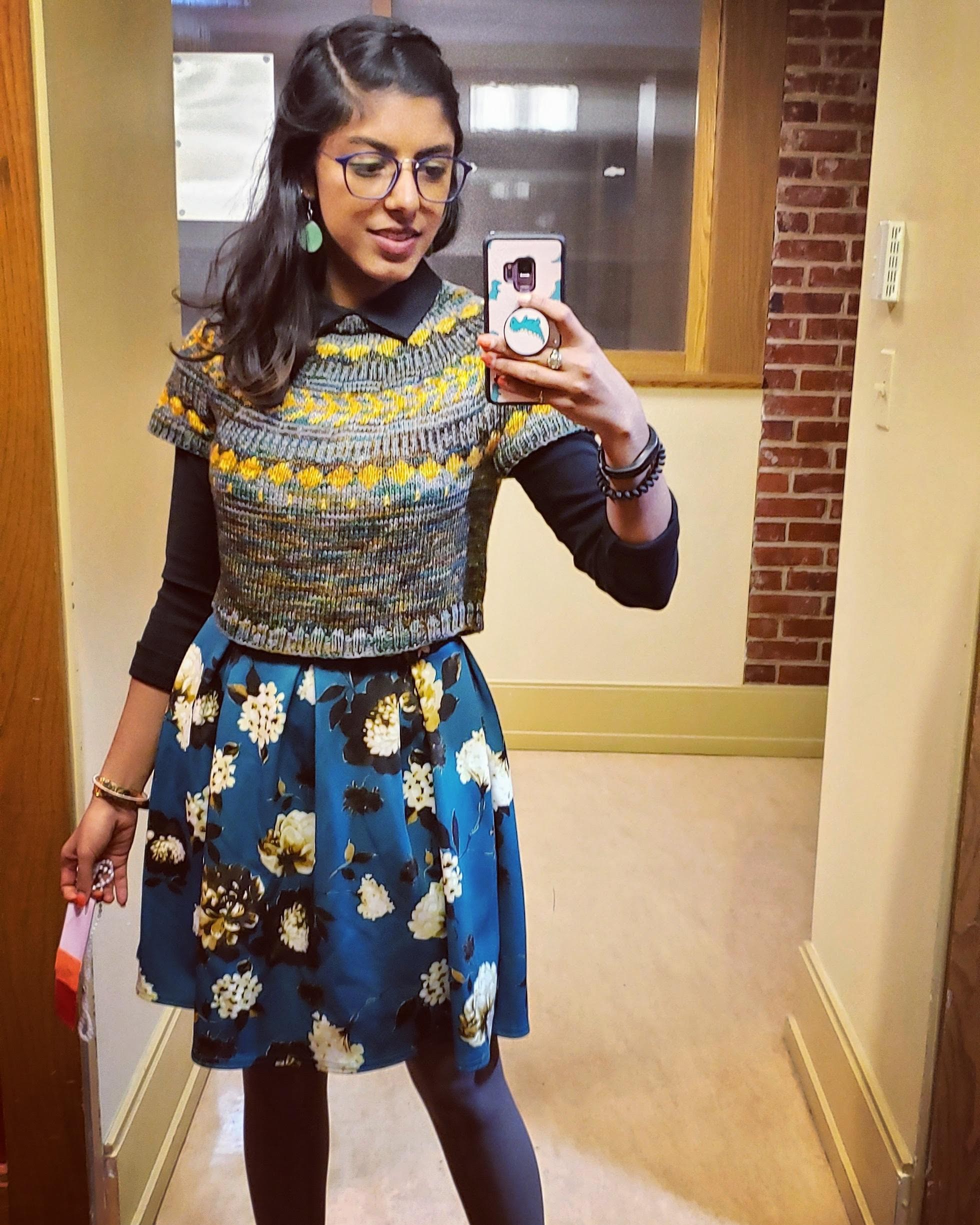shelly wears a cropped short-sleeve colorwork sweater over a floral dress