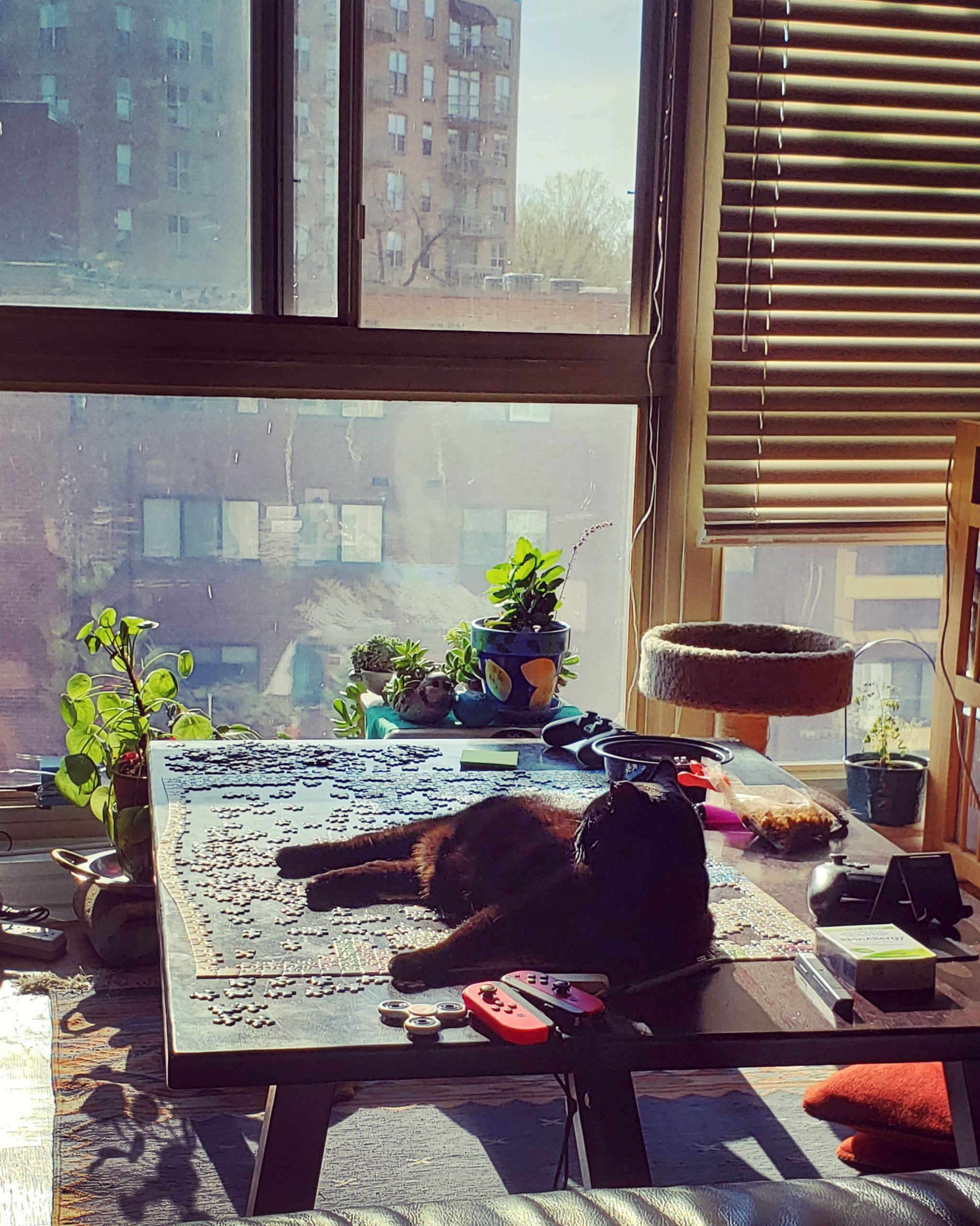 a black cat lounging on a sunny table