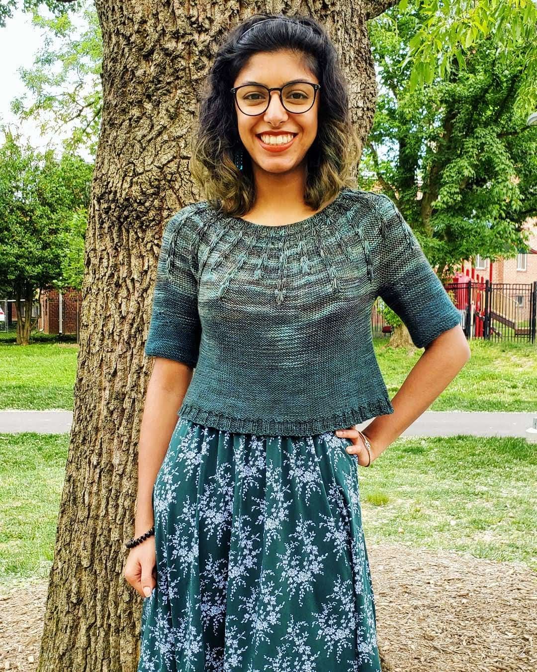 shelly wears a cropped green sweater with textured yoke over a patterned dress
